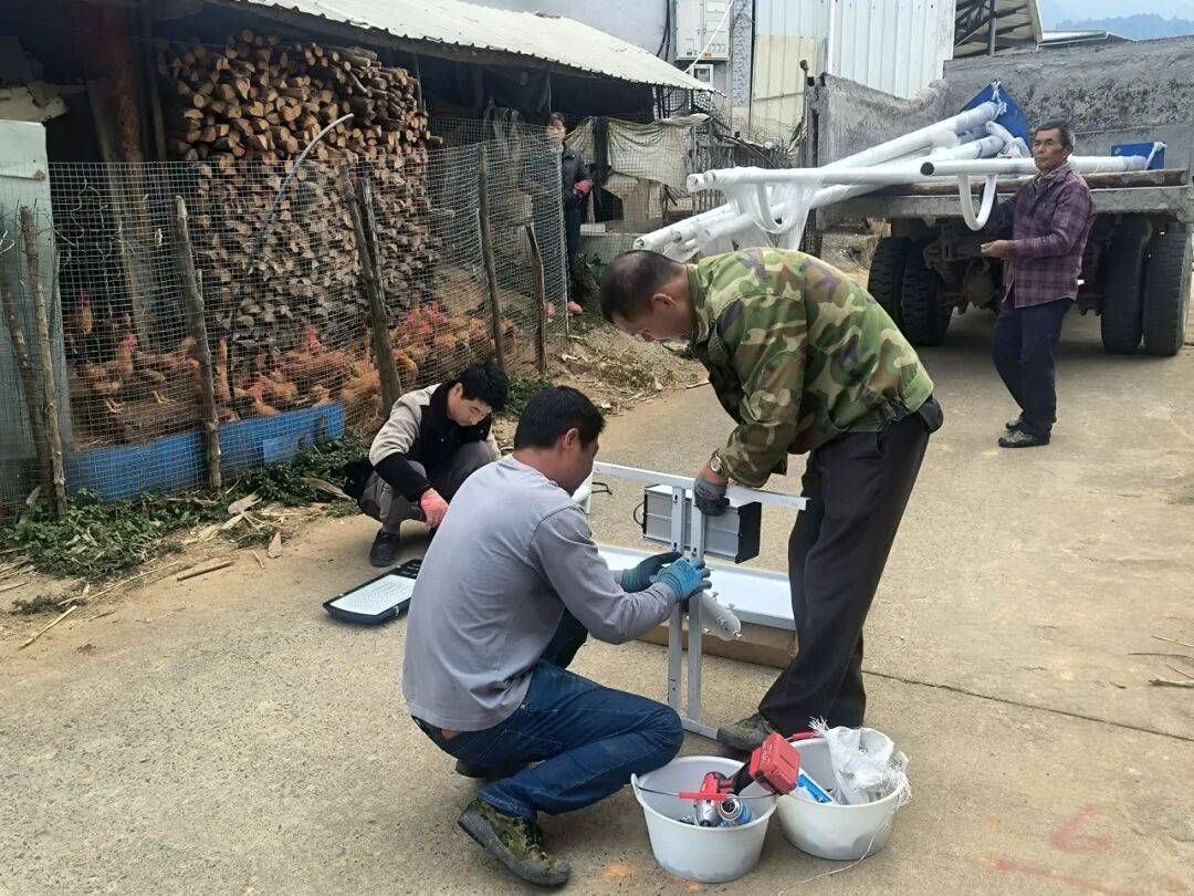 近日,湖林乡湖林村中心片区的乡间小道上,几位工人正蹲在路边组装太阳能路灯。