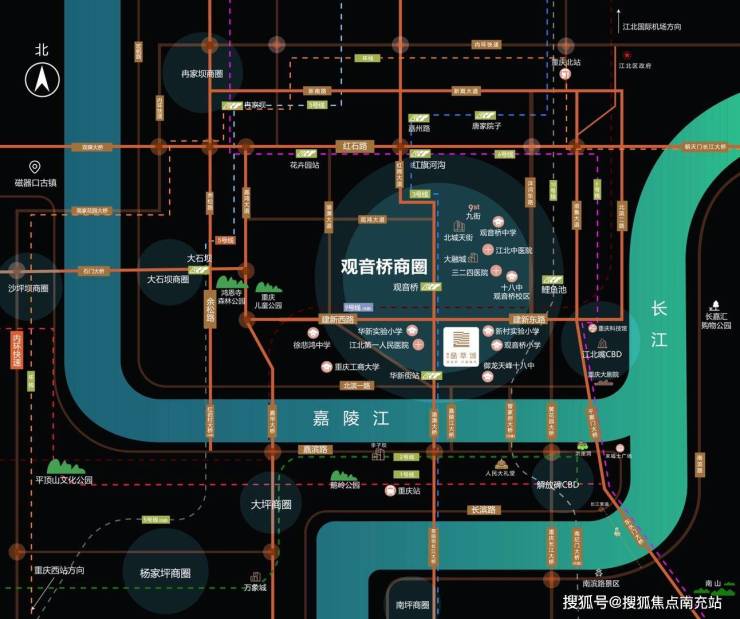 观音桥是江北区政治、经济和交通枢纽,浓缩全城精华资源——多维立体的交通路网、丰富的生活配套,超强的经济和人流聚合力,是一个不用等待成长的区域。观音桥商圈——重庆最大的商业集聚区之一,是城市核心,有重庆首个千亿级城市核心商圈,2019年被中国购物中心评为“国家五星购物中心”。
