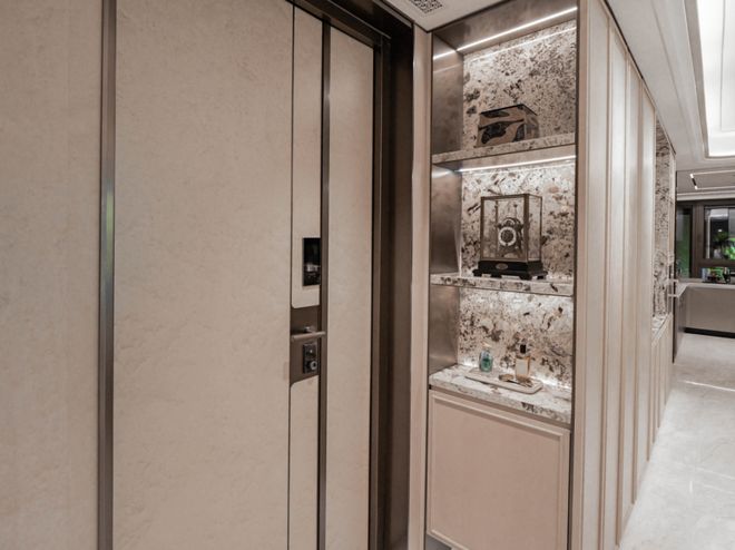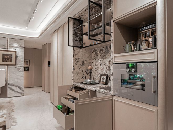 根据项目周边的过会价格,我们预计项目的起步门槛在1400万左右。但保利外滩启Park77交付的,却是能媲美市中心3000万级别的装修标准。