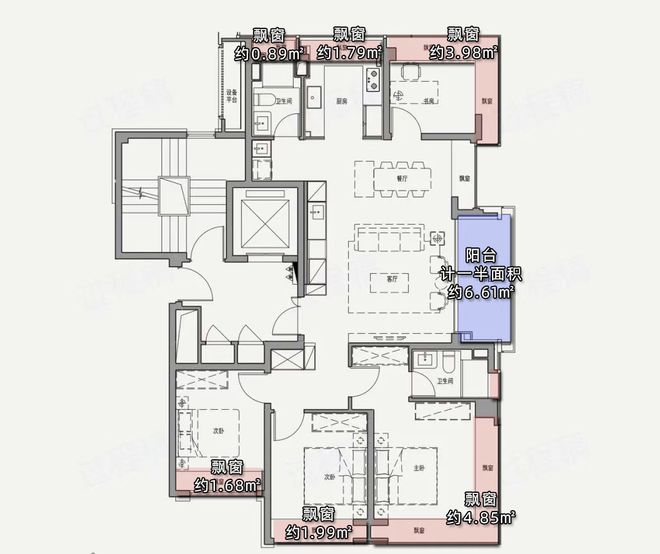 以样板间建面约137㎡F户型为例,整个户型拥有8个飘窗,每一个功能空间,堪称飘窗全覆盖。其中,两个飘窗为270°转角飘窗,等于就拥有了10个飘窗!