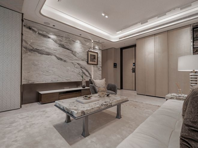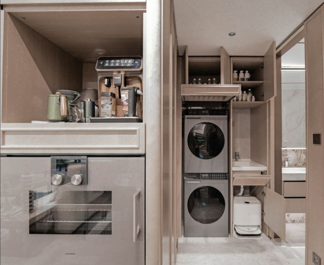 来到客厅,收纳空间更是拉满。次净衣区、餐边柜全部是交付标准,大面积影木的使用,加上装饰主义细节,质感出众: