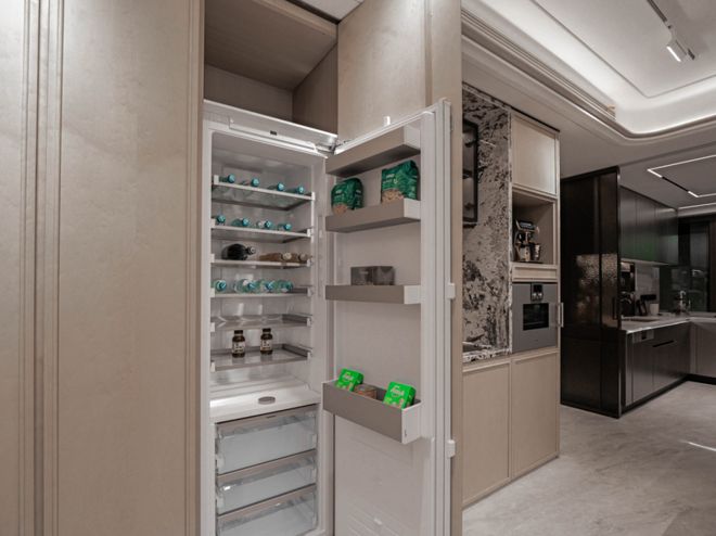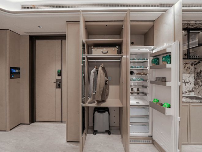 以137㎡户型为例,进门右手边是一门到顶的玄关柜收纳,转角之后,还有一个进深约60cm的豪华收纳,可以用来收纳业主的行李箱、童车、平衡车等等。