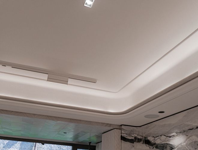 当下在顶豪里流行的弧形元素,项目也全部采用,幻日流光岩板、柳叶拼/鱼骨拼地板、踢脚线、吊顶等,“弧线拉满”,势必要给业主顶豪的居住体验:
